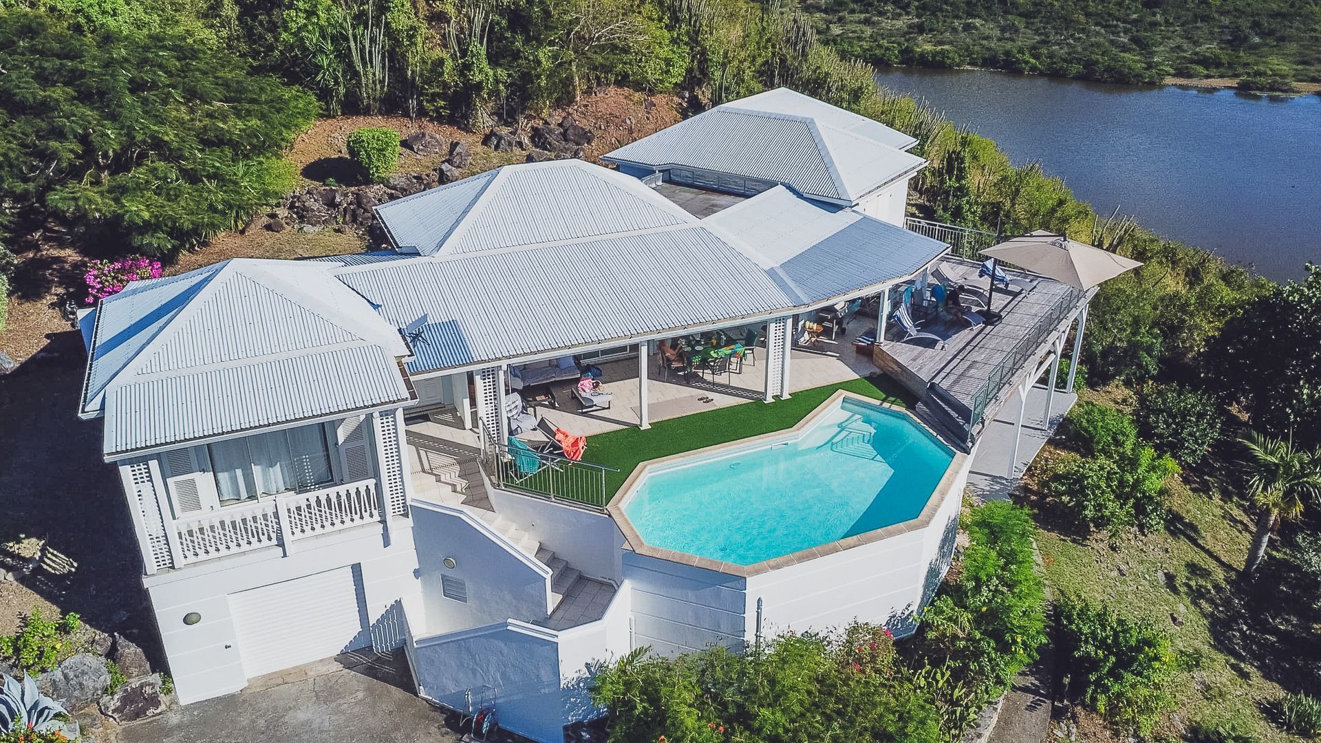 Expansive terrace with shaded dining and lounge areas