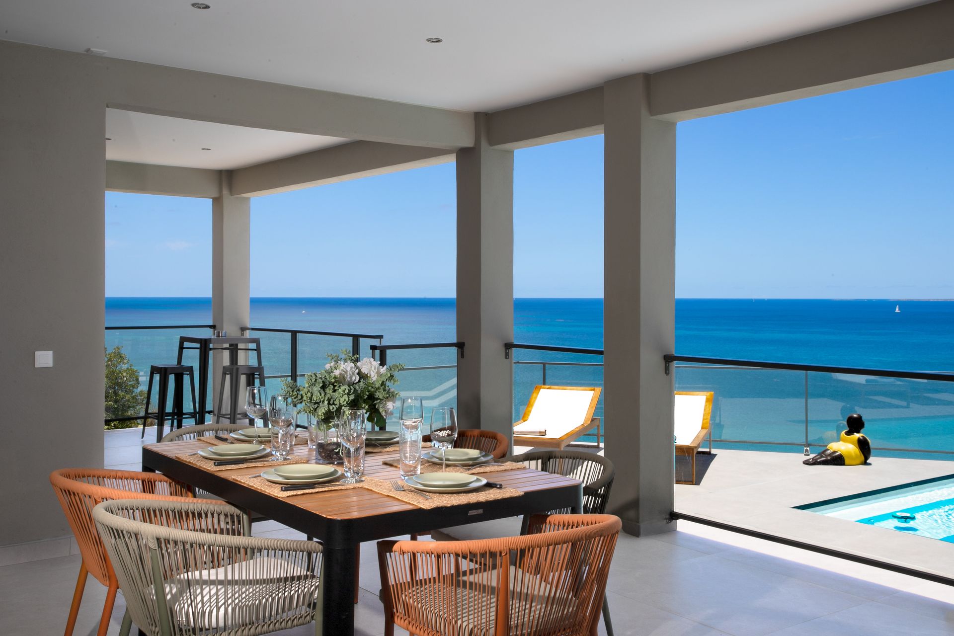 Wrap-around terrace with lounge seating and sunbeds