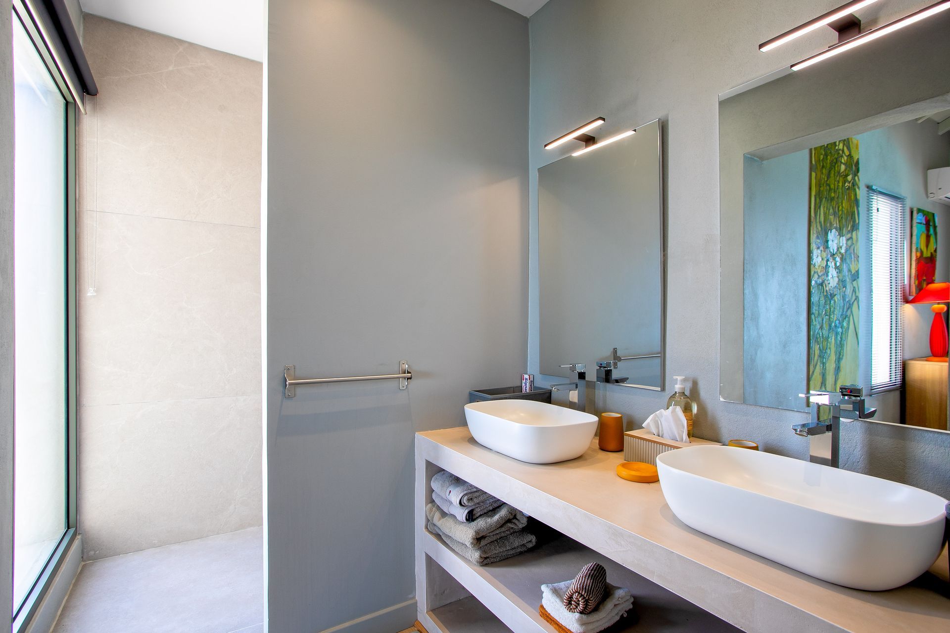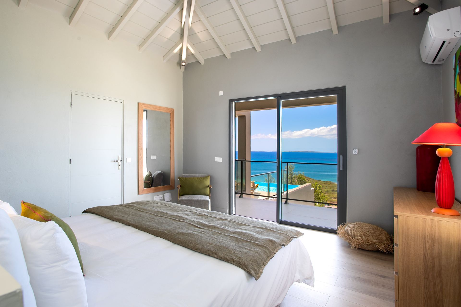 All three bedrooms are generously sized and feature premium linens, air-conditioning, and en suite bathrooms. Each has direct access to the terrace, blending indoor and outdoor living while offering ocean or garden views. Ideal for couples, families, or groups looking for both comfort and privacy.